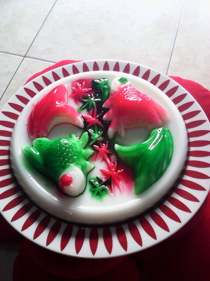 Masukkan agar-agar putih ke dalam wadah beserta susu, aduk rata, lalu dipanaskan sampai mendidih, setelah mendidih, masukkan kedalam cetakan ikan koi, lalu didinginkan